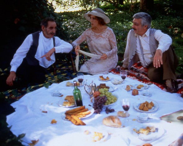 Pushing 100, Portuguese writer-director Manoel de Oliveira is our oldest living film master, which makes it all the more astonishing that he’s averaged one feature a year since the ’80s. His finest work is bound to literature and theater, and this eccentric triptych (1998) is one of its absolute peaks. It consists of a one-act play (Prista Monteiro’s The Immortals) and a story by Antonio Patricio about four people who attend it, one of whom recounts the third story, Agustina Bessa-Luis’s The Mother of the River. The theme of this exquisite masterpiece, linking all three parts, is existential identity, played out in each case by two characters — father and son, playboy and prostitute, young village woman and ancient witch. The witch is played by Irene Papas, and de Oliveira can be seen dancing with his wife in the middle episode. In Portuguese with subtitles. 114 min. (JR)