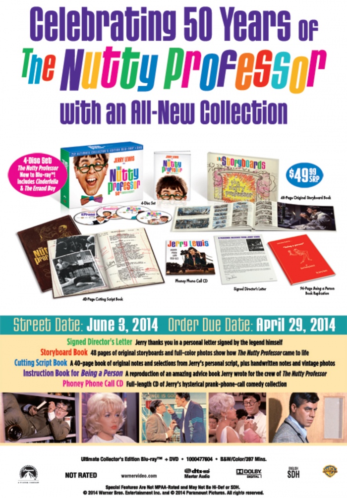 Leave it to Jerry Lewis to offer us a deluxe and unshelvable Blu-ray + DVD edition of The Nutty Professor (1963) from Warner Video, built like a doorstop—the most cumbersome single object released since Murnau, Borzage and Fox. But in this case, at least, you can extract a normal-size box containing the dual-format Nutty Professor (with many extras) along with DVDs of Frank Tashlin’s 1960 Cinderfella and Lewis’ 1961 The Errand Boy (both with audio commentaries) and place the other materials elsewhere: a hardcover book devoted to Nutty Professor storyboards, a softcover book devoted to portions of the annotated script, another softcover book written by Lewis expressly for the crew of Nutty Professor (it’s called Instruction Book for “Being a Person”, and one might reasonably ask whether this was written by the Julius Kelp or the Buddy Love side of Lewis’s Jekyll-and-Hyde combo), a relatively disposable CD of Lewis’ Phoney [sic] Phone Calls, 1959-1972, and finally, “A Personal Message from Jerry Lewis” that states, among other things, that he agrees that The Nutty Professor is his best work but finds it hard to call it his favourite.