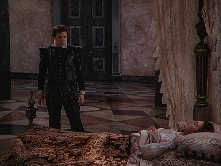 In Susan Felleman’s lovely auteurist study of Lewin, Botticelli in Hollywood, she charts in detail the film’s Surrealist sources, ranging from Man Ray (a friend of Lewin’s) to Giorgio de Chirico, and I think it could even be argued that this movie is the supreme encounter between Surrealism and Hollywood. (By contrast, the dream sequence designed by Dali in Hitchcock’s Spellbound is fairly drab and pedestrian.) So maybe part of the discrepancy between continental and American responses to this film is simply a matter of having a cultural context for the film’s delirious and deliberate romantic excesses. The story is centered on two mythical archetypes–Pandora (Gardner), an American chanteuse in a small colony of expatriates in Esperanza, a village on Spain’s Costa Brava circa 1930, who lures men to their doom, and the Flying Dutchman (Mason), a mysterious and taciturn sea captain who arrives one day. Condemned many centuries ago for the murder of his innocent bride and for blasphemy, he’s obliged to sail alone in his ship for all eternity unless he finds a woman willing to die for him. (This film is almost precisely contemporary with Orson Welles’ Othello, and there’s an uncanny echo of a shot in which Othello approaches Desdemona in her bed, when we see Mason in a flashback approaching his own bride.)